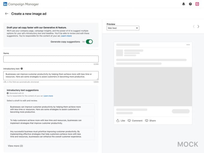 κυκλοφόρησε μια σειρά από δημιουργικά εργαλεία βασισμένα σε τεχνητή νοημοσύνη για να βοηθήσει τους διαφημιστές να δημιουργήσουν διαφορετικές καμπάνιες, το LinkedIn παρουσίασε το δικό του εργαλείο για να προτείνει διαφορετικά αντίγραφα μιας διαφήμισης.