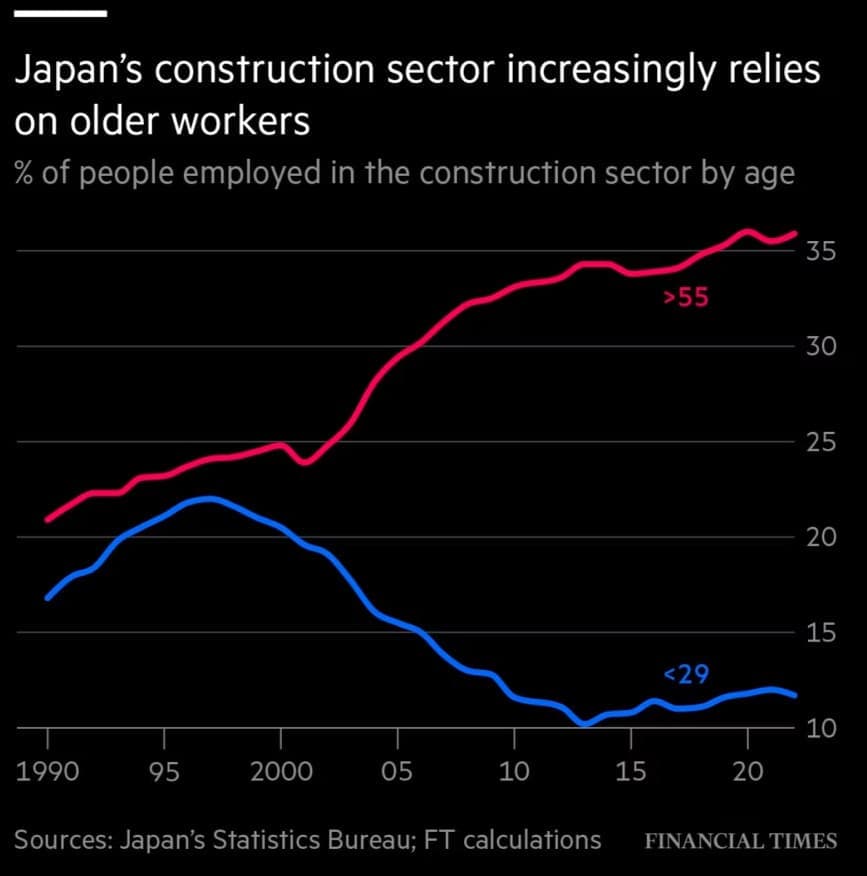 Τα στοιχεία του υπουργείου δείχνουν επίσης ότι μόνο το 12 τοις εκατό των εργαζομένων στις κατασκευές είναι ηλικίας κάτω των 29 ετών, ενώ περίπου το 36 τοις εκατό είναι άνω των 55 ετών. Τόσο σοβαρά είναι τα προβλήματα προσωπικού του κλάδου που του δόθηκε προθεσμία πέντε ετών για να προετοιμαστεί για τους νέους κανόνες εργασίας που έρχονται σε ισχύ τον Απρίλιο που θα περιόριζε τις υπερωρίες για εργάτες οικοδομών και οδηγούς φορτηγών.