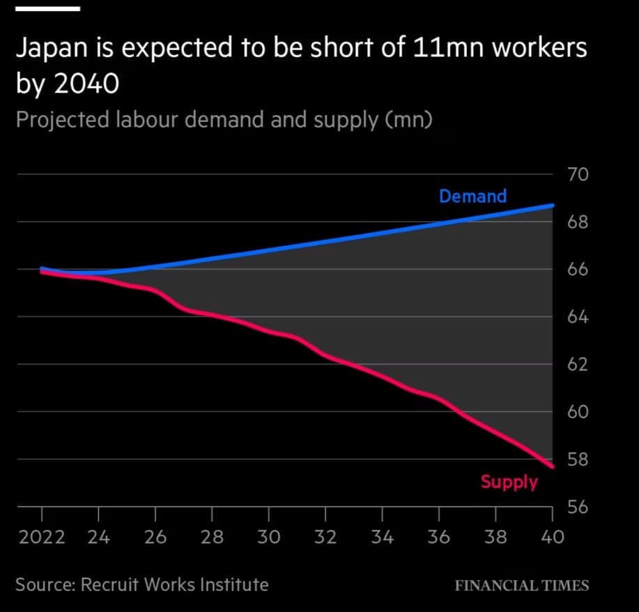 Την τελευταία δεκαετία, η Ιαπωνία βασίστηκε σε γυναίκες και ηλικιωμένους εργαζόμενους ενόψει των αυστηρών περιορισμών στην πρόσληψη εργαζομένων στο εξωτερικό. Ωστόσο, ο Naruhisa Nakagawa, ιδρυτής του hedge fund Caygan Capital, είπε ότι από φέτος αυτό δεν θα είναι πλέον αρκετό και το εργατικό δυναμικό της χώρας θα αρχίσει να μειώνεται.