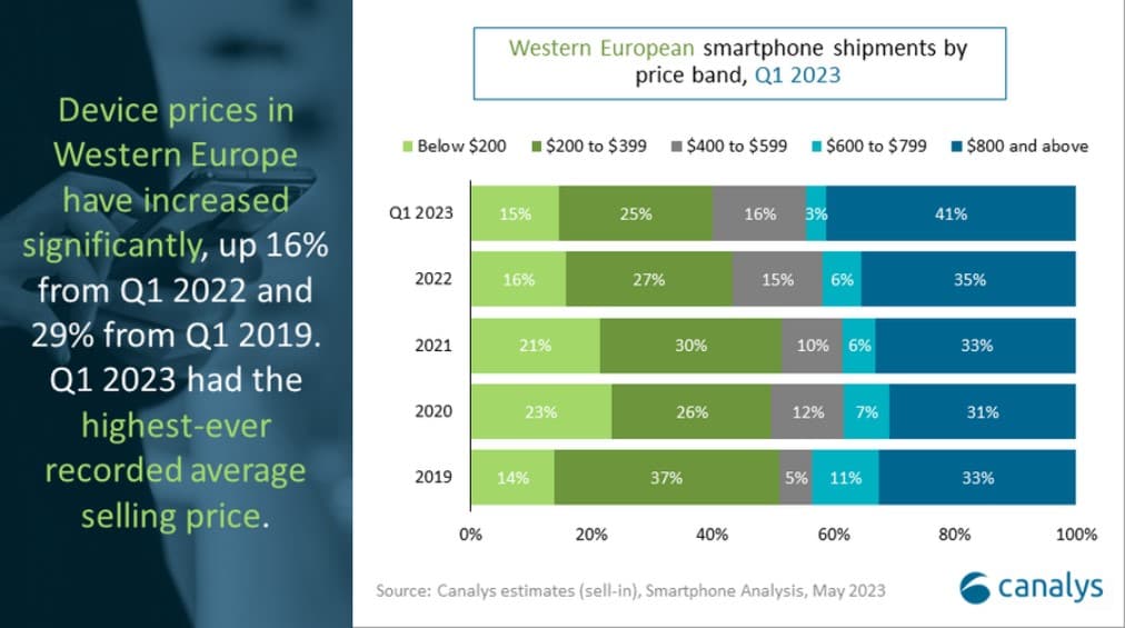 Συνολικά, οι τιμές των συσκευών στη Δυτική Ευρώπη έχουν αυξηθεί σημαντικά, κατά 16% από το α’ τρίμηνο του 2022 και 29% από το πρώτο τρίμηνο του 2019, ενώ κινήθηκαν ανοδικά και το α’ τρίμηνο του 2023».