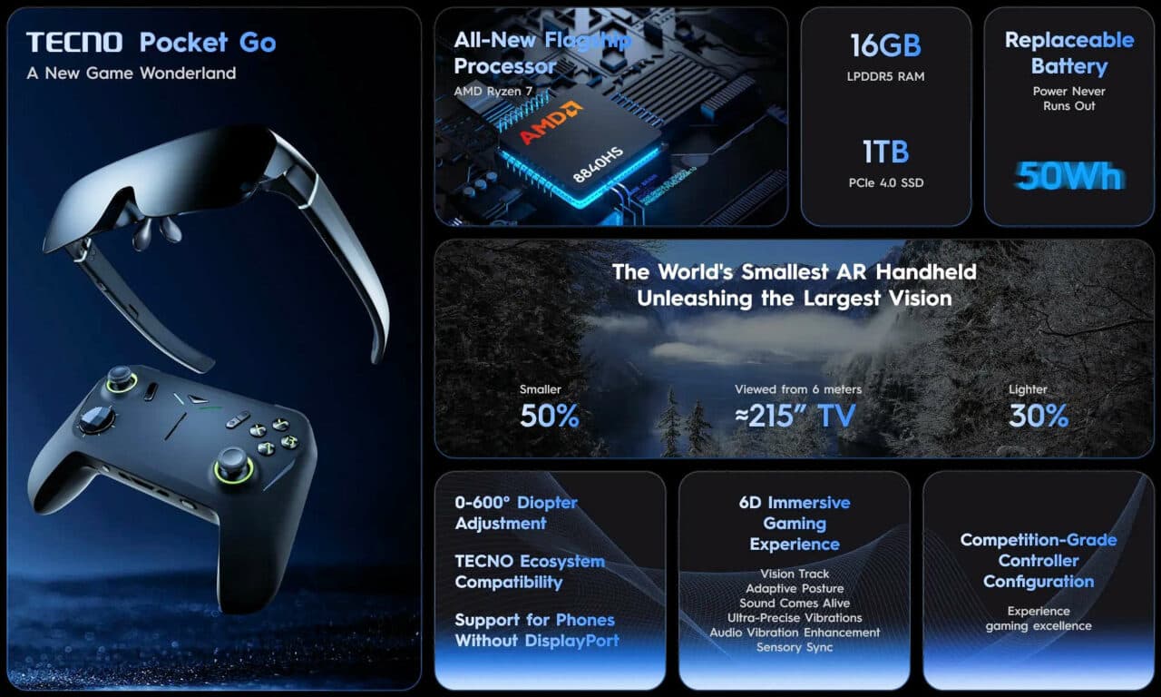 Το Tecno AR Pocket Vision είναι μια combo συσκευή και προορίζεται να λειτουργεί με το Pocket Go. Το ίδιο το Pocket Vision είναι ένα ζευγάρι γυαλιά επαυξημένης πραγματικότητας. Διαθέτει γυροσκόπιο έξι αξόνων και έναν αλγόριθμο τροφοδοτούμενο από AI που βοηθά στον προσδιορισμό των κινήσεων του κεφαλιού. Υπάρχει επίσης μια μικρο-οθόνη OLED 0,71 ιντσών που προσφέρει την εικόνα μιας τηλεόρασης 215 ιντσών όταν την βλέπει κανείς σε απόσταση έξι μέτρων.