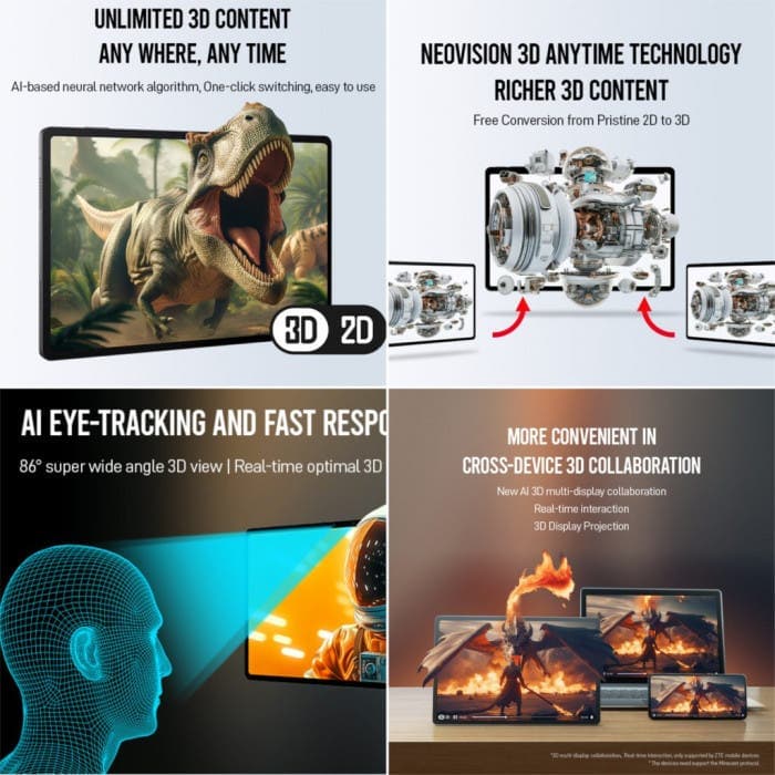 Τα τελευταία χρόνια, η ZTE επενδύει ενεργά στην έρευνα και ανάπτυξη για τεχνολογία και οικοσύστημα 3D χωρίς γυαλιά. Το nubia Pad 3D II είναι το πρώτο που ενσωμάτωσε το 5G και την τεχνητή νοημοσύνη στη βιομηχανία, έχοντας σημειώσει σημαντική πρόοδο στα 3D οπτικά εφέ και την τεχνολογία Neovision 3D ανά πάσα στιγμή. Όσον αφορά το 5G, η ZTE συνεργάζεται στενά με την China Mobile και όλους τους συνεργάτες για τη δημιουργία ενός τρισδιάστατου οικοσυστήματος πλήρους οθόνης, επιτρέποντας σε περισσότερους καταναλωτές να απολαύσουν τη γοητεία του.