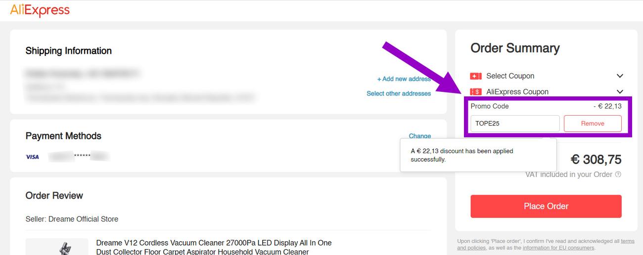 Το κουπόνι μπορεί να χρησιμοποιηθεί μόνο στη σύνοψη της παραγγελίας, δηλαδή μετά την εισαγωγή της διεύθυνσης και των στοιχείων πληρωμής. Στη συνέχεια, η πληρωμή συνεχίζεται.