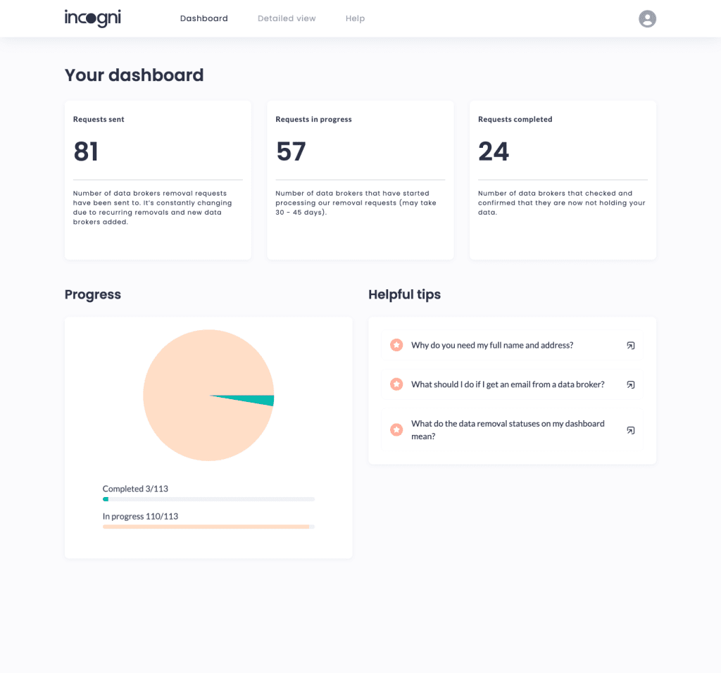Από εκεί, η Incogni χειρίζεται όλα τα υπόλοιπα, αφαιρώντας τις πληροφορίες σας από τους πολλούς μεσίτες δεδομένων και επιλύοντας τυχόν αμφισβητούμενες αξιώσεις. Μπορείτε ακόμη και να το παρακολουθήσετε όπως συμβαίνει μέσω του παρεχόμενου πίνακα εργαλείων που δείχνει την πρόοδο κάθε αφαίρεσης.