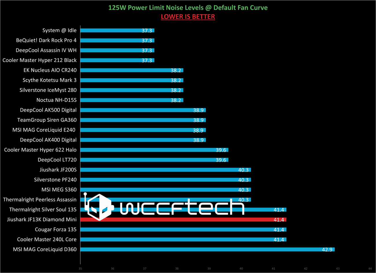 Η απόδοση είναι μόνο ένα μέρος της εικόνας, τα επίπεδα θορύβου είναι εξίσου σημαντικά. Στα 45,6 dBA, τα μέγιστα επίπεδα θορύβου αυτού του μοναδικού ψυγείου CPU βρίσκονται ακριβώς στη μέση των άλλων προϊόντων που έχω δοκιμάσει.