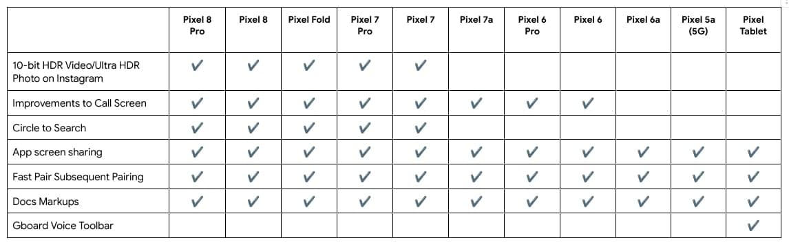 (5G), Pixel 6/6 Pro/6a, Pixel 7/7 Pro/7a, Pixel 8/8 Pro, Pixel Fold, Pixel Tablet και Pixel Watch και θα το κάνει στο φάσεις.