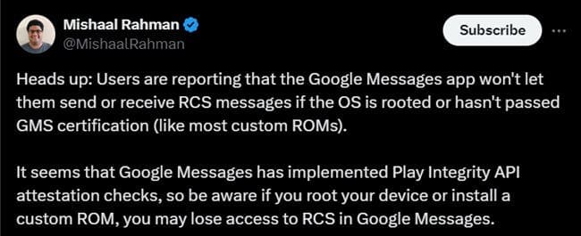 υποδεικνύουν ότι το RCS δεν λειτουργεί λόγω rooting. Η Google περιορίζει επίσης τις συσκευές που ξεκλειδώνουν με bootloader να χρησιμοποιούν RCS για να αποτρέψει ανεπιθύμητα μηνύματα και να διασφαλίσει τη συμμόρφωση με τα “λειτουργικά μέτρα” του RCS, τα οποία επιβεβαιώθηκαν από το 9to5Google.