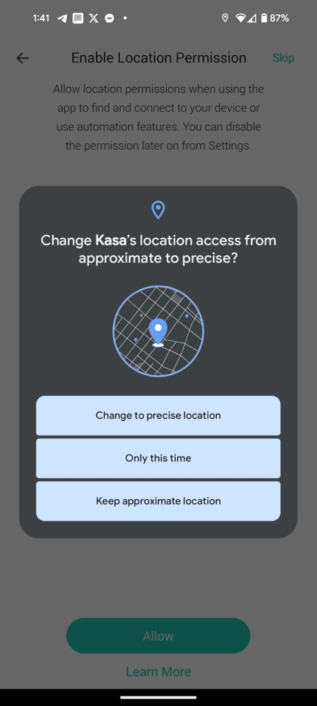 Ακόμη και οι εφαρμογές που θα πρέπει να χρησιμοποιούν την άδεια “Nearby”, όπως η εφαρμογή Kasa του TP-Link, εξακολουθούν να απαιτούν πρόσβαση στην τοποθεσία “Ακριβής” για να επιτρέπεται η χρήση των βασικών λειτουργιών της εφαρμογής.
