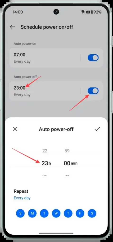 Στη συνέχεια, πατήστε στην εναλλαγή Auto Power On και ορίστε την ώρα που θέλετε να ενεργοποιείται η συσκευή σας.