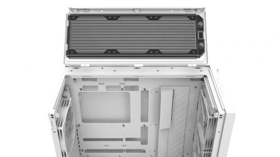 Το πιο σημαντικό χαρακτηριστικό της νέας θήκης είναι οι τρεις ανεμιστήρες ARGB στο μπροστινό μέρος και το πολύ μεγάλο μπροστινό πάνελ με τετράγωνη τρύπα μέσα από το οποίο λάμπουν. Απέχει πολύ από τις προσόψεις με διπλό γυαλί πολλών δημοφιλών θηκών διπλού θαλάμου ή το κομψό στυλ του Fractal Design North. Ωστόσο, υπάρχει μια σαφής στιβαρή, απλή γοητεία σε αυτό.