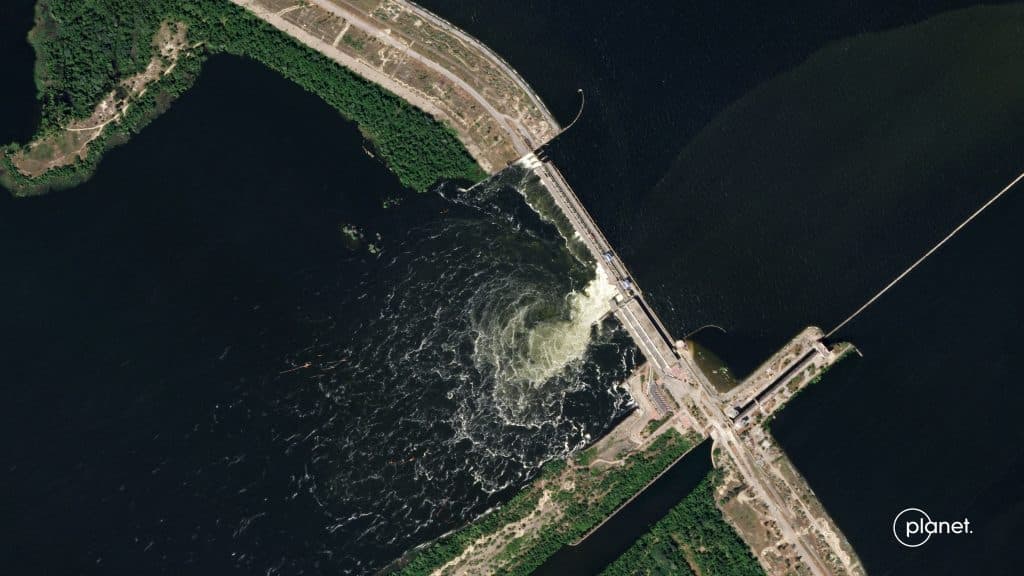 Ουκρανία και Ρωσία αλληλοκατηγορούνται για την ανατίναξη του φράγματος Κάκοβκα, εδώ σε δορυφορική φωτογραφία (Reuters)