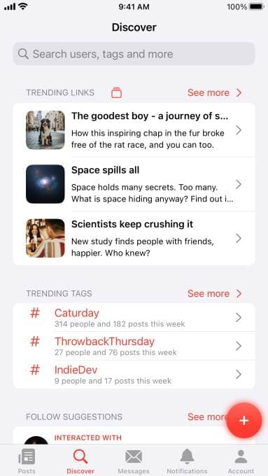 Μία από τις μεγαλύτερες προκλήσεις με το Mastodon είναι να ανακαλύψεις ανθρώπους που πρέπει να ακολουθήσεις. Το Radiant παρέχει προτάσεις με βάση τα άτομα που ακολουθείτε και με τα οποία έχετε αλληλεπιδράσει. Ο Nelson είπε ότι οι λειτουργίες προτάσεων, συμπεριλαμβανομένων των ατόμων, των trending hashtag και των δημοφιλών άρθρων εξαρτώνται από την περίπτωση όπου φιλοξενήθηκε ο λογαριασμός σας. Είπε ότι προσπαθεί να αξιοποιήσει μεγαλύτερες περιπτώσεις για να συμπεριλάβει κάποιες τάσεις από αυτούς τους διακομιστές.