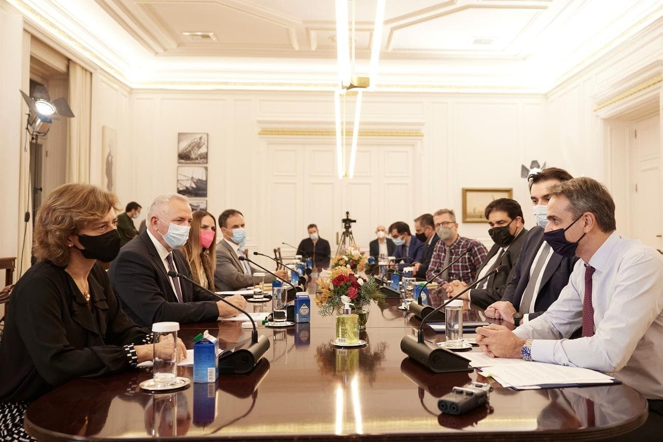 , κ. Κυριάκο Πιερρακάκη, ο CEO του Ομίλου Deutsche Telekom, κ. Tim Höttges, η επικεφαλής της Deutsche Telekom για την Ευρώπη, κα Dominique Leroy, ο Πρόεδρος και Διευθύνων Σύμβουλος του Ομίλου ΟΤΕ, κ. Μιχάλης Τσαμάζ, και η Νομική Σύμβουλος και Chief Officer Νομικών & Ρυθμιστικών Θεμάτων Ομίλου ΟΤΕ, κα Ειρήνη Νικολαΐδη, σε συνάντηση που πραγματοποιήθηκε στο Μέγαρο Μαξίμου.