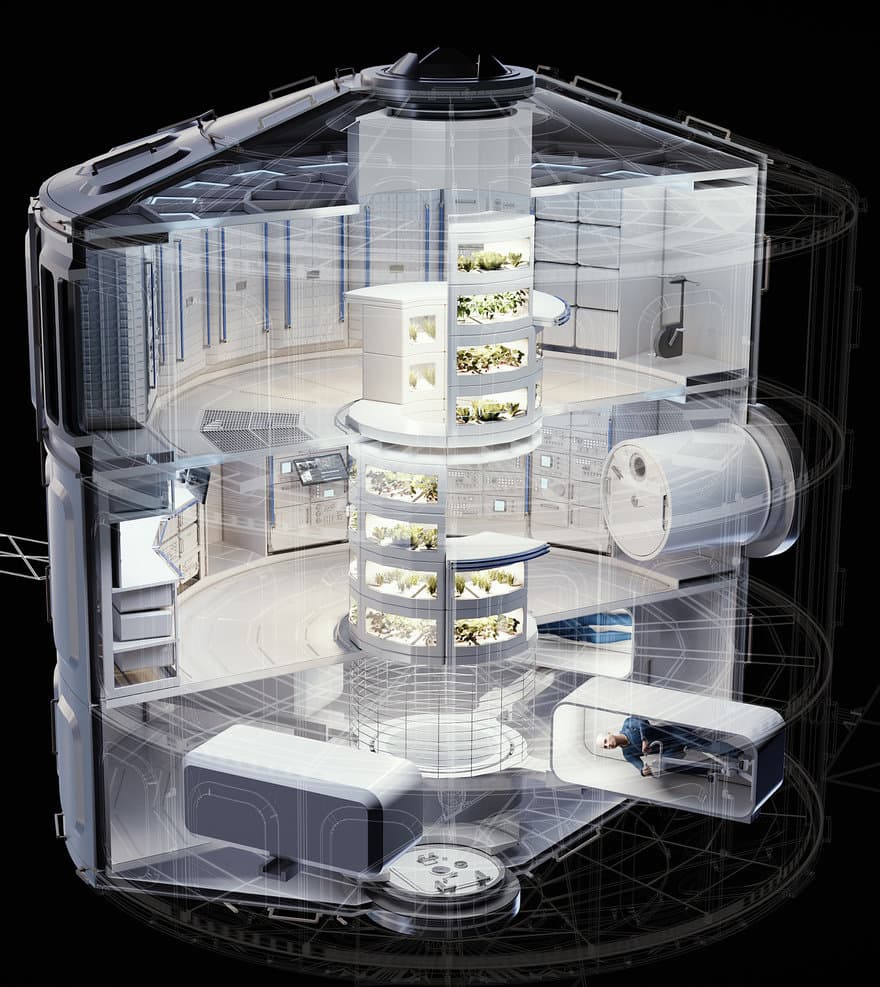 Κάθε όροφος είναι προσβάσιμος μέσω ενός κεντρικού τούνελ, το οποίο περιβάλλεται από μία κατασκευή θερμοκηπίου και μπορεί να φιλοξενήσει πειράματα με φυτά ή να προσφέρει μία σταθερή παροχή λαχανικών, παρόμοια με τα θερμοκήπια του ISS.