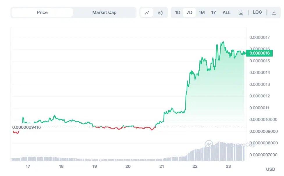 Καθώς τα νέα ώθησαν το εμβληματικό περιουσιακό στοιχείο της αποκεντρωμένης χρηματοδότησης (DeFi) να εκτοξευθεί στα ύψη, το Pepe ακολούθησε και έκτοτε κινείται ανοδικά, κερδίζοντας 5,84% την ημέρα και 66,07% την εβδομάδα, παρά το γεγονός ότι έχασε 1,15% στο μηνιαίο διάγραμμα, αλλά επί κινείται στα $0,000001564.