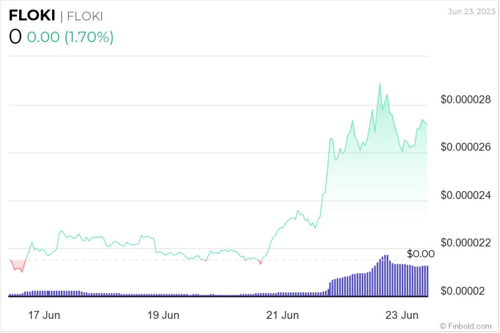 Επί του παρόντος, το FLOKI διαπραγματεύεται στην τιμή των $0,00002699, που αντιπροσωπεύει αύξηση 1,70% την ημέρα και 24,99% την περασμένη εβδομάδα, παρά την πτώση 17,18% τις προηγούμενες 30 ημέρες, όπως δείχνουν τα πιο πρόσφατα γραφήματα στα οποία έχει πρόσβαση η Finbold.