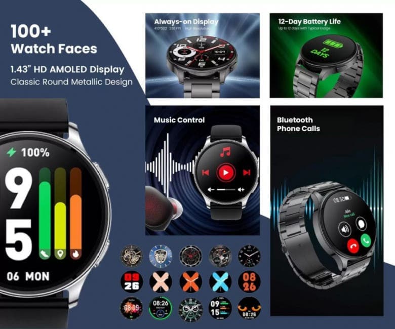 - 1.43-inch (466 x 466 pixels) AMOLED 460PPI screen, always on display