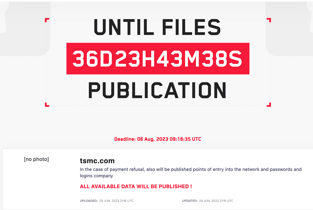 Η συνδεδεμένη με τη Ρωσία συμμορία ransomware LockBit κατέγραψε την TSMC στον ιστότοπο διαρροής του σκοτεινού ιστού την Πέμπτη. Η συμμορία απειλεί να δημοσιεύσει δεδομένα που έχουν κλαπεί από την εταιρεία, η οποία κατέχει το 60% της παγκόσμιας αγοράς χυτηρίων, εκτός εάν η εταιρεία πληρώσει 70 εκατομμύρια δολάρια για λύτρα. Αυτή είναι μια από τις μεγαλύτερες γνωστές απαιτήσεις για λύτρα στην ιστορία,
