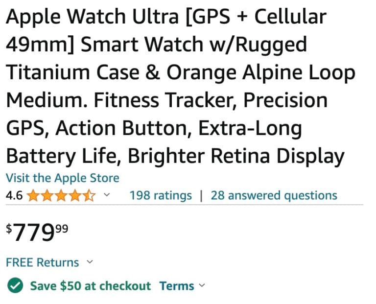 Στα 799 $, το Apple Watch Ultra είναι σίγουρα μια ακριβή πρόταση. Ωστόσο, στο Amazon αυτή τη στιγμή, θα το βρείτε σε προσφορά με μια ωραία μεγάλη έκπτωση 70 $. Και όπως ανέφερα προηγουμένως, μερικές διαφορετικές επιλογές μπάντας πωλούνται με την ίδια βαθιά έκπτωση. Αυτό δεν συμβαίνει σχεδόν ποτέ, επομένως μπορείτε να κάνετε κλικ στις διάφορες διαμορφώσεις για να δείτε ποια μοντέλα είναι σε προσφορά.