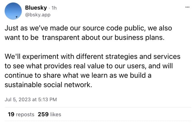 Με τη χρηματοδότηση, η Bluesky δεσμεύεται επίσης να βρει μια πορεία προς τα εμπρός για τη δημιουργία εσόδων, σημειώνοντας στην ανάρτηση ιστολογίου ότι «θα πειραματιστεί με διαφορετικές στρατηγικές και υπηρεσίες για να δει τι προσφέρει πραγματική αξία στους χρήστες μας και θα συνεχίσει να μοιράζεται αυτά που μαθαίνουμε καθώς χτίζουμε ένα βιώσιμο κοινωνικό δίκτυο».
