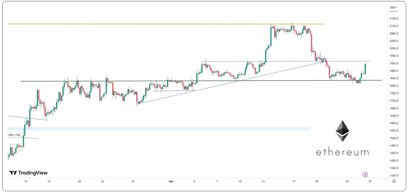 . Το δεύτερο σε κεφαλαιοποίηση κρυπτονόμισμα κράτησε, έστω και δύσκολα, τη στήριξη των 1.830 δολαρίων και οδεύει προς τις 1.930. Την επόμενη δοκιμασία.