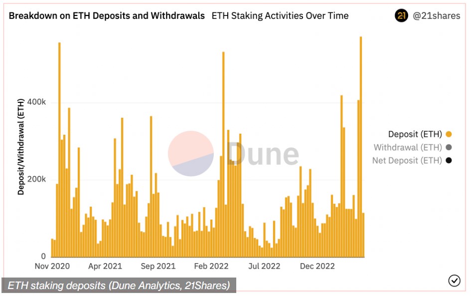 . Μέχρι στιγμής, ο ρυθμός των νέων καταθέσεων έχει ξεπεράσει το ποσό που εξέρχεται από το δίκτυο, αν εξαιρεθούν οι ανταμοιβές. Ο βασικός λόγος, σύμφωνα με τις εταιρείες ερευνών, είναι πως θεσμικοί έλαβαν τις αμοιβές και τις επανεπένδυσαν. Έβαλαν για staking τα Ethereum που είχαν κερδίσει.