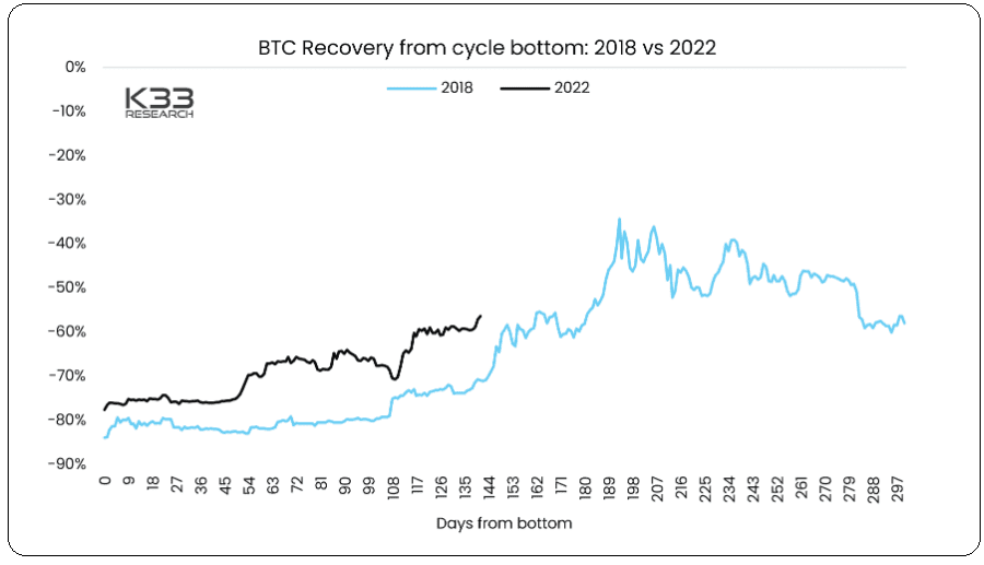 Αν παρατηρήσουμε την πορεία της τιμής του Bitcoin που ξεκινάει από την κορυφή του Νοεμβρίου 2021, συνεχίζει με την βουτιά που ακολούθησε, μέχρι την πρόσφατη ανάκαμψη, παρουσιάζει πολλά κοινά χαρακτηριστικά με την περίοδο του bear market της περιόδου 2018-19, όσο αφορά το μήκος και την τροχιά. Αυτά υποστηρίζει