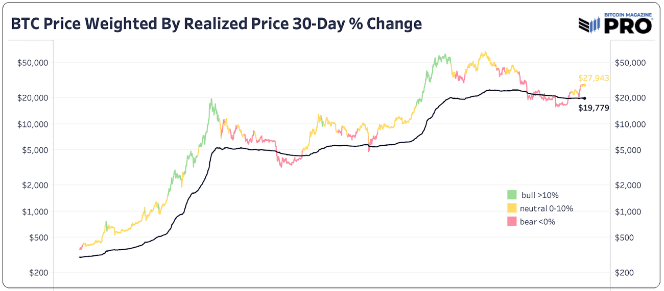, ο οποίος αθροίζει όλα τα νομίσματα σταθμίζοντας την αξία τους την τελευταία φορά που κουνήθηκαν. Ο δείκτης αυτός δίνει πληροφορίες για την πραγματική αξία που έχει αποθηκευτεί και μεταφερθεί εντός δικτύου, ενώ παράλληλα αφαιρεί εμμέσως τα νομίσματα που έχουν χαθεί ή έχουν να κινηθούν πολλά χρόνια. Η τιμή του Bitcoin σπάνια βρίσκεται κάτω από την πραγματοποιηθείσα τιμή, για μεγάλο χρονικό διάστημα, όπως αναδεικνύει το παρακάτω διάγραμμα.