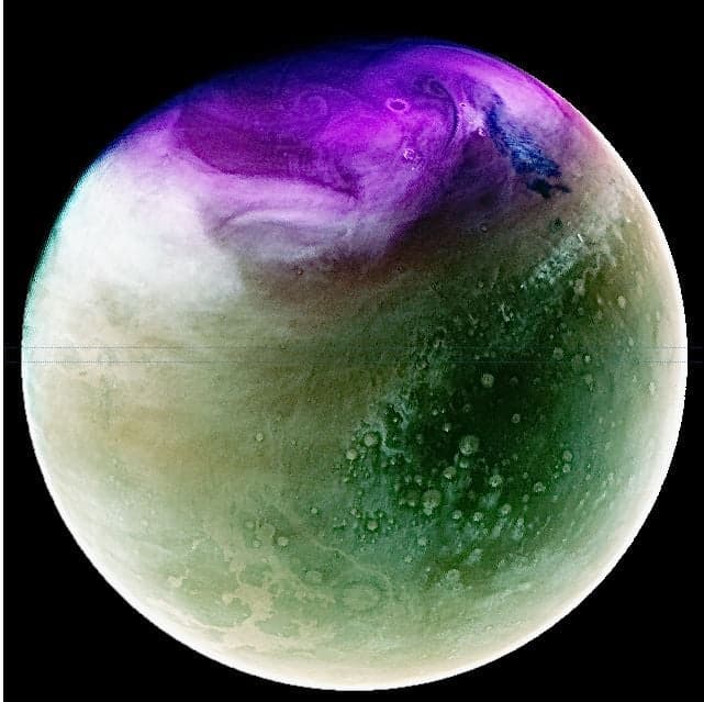 δύο νέες πραγματικά μοναδικές εικόνες. Πρόκειται για φωτογραφίες του Κόκκινου Πλανήτη που κατέγραψε το σκάφος της αποστολής MAVEN με το όργανο υπεριώδους φασματοσκοπία IUVS. Σε αυτές τις εικόνες το όζον στην ατμόσφαιρα του Άρη εμφανίζεται με βυσσινί χρώμα ενώ τα σύννεφα και η ομίχλη εμφανίζονται λευκά ή μπλε. Η επιφάνεια μπορεί να φαίνεται πράσινη ή με απόχρωση ανοικτού καφέ προς το κίτρινο.