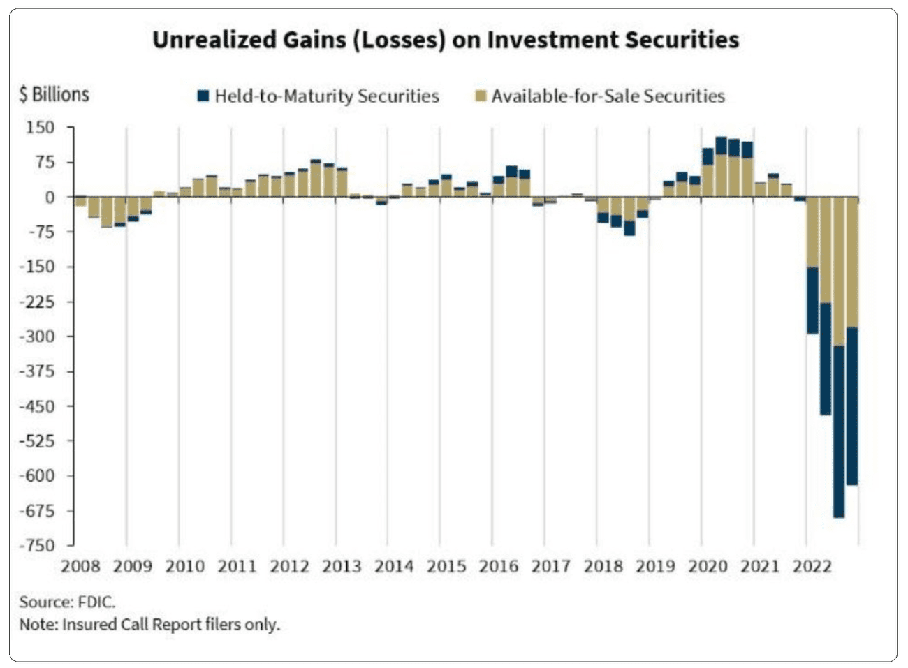 από το να πουλήσουν τα ομόλογά με ζημία πριν τη λήξη τους, για να καλύψουν την απομάκρυνση των αυξημένων απότομα λόγω των πολιτικών νομισματικής και δημοσιονομικής επέκτασης, καταθέσεων. Οι μη πραγματοποιηθείσες ζημίες στους ισολογισμούς της τράπεζας, έγιναν απροσδόκητα πραγματικές, προκειμένου να καλυφθούν οι ανάγκες ρευστότητας, επιταχύνοντας το bank run. Οι εκτιμώμενες μη πραγματοποιηθείσες ζημίες των χρεογράφων των τραπεζών στις ΗΠΑ που διακρατούνται μέχρι τη λήξη ανήλθαν συνολικά σε 620 δισεκατομμύρια δολάρια στο τέλος του 2022.