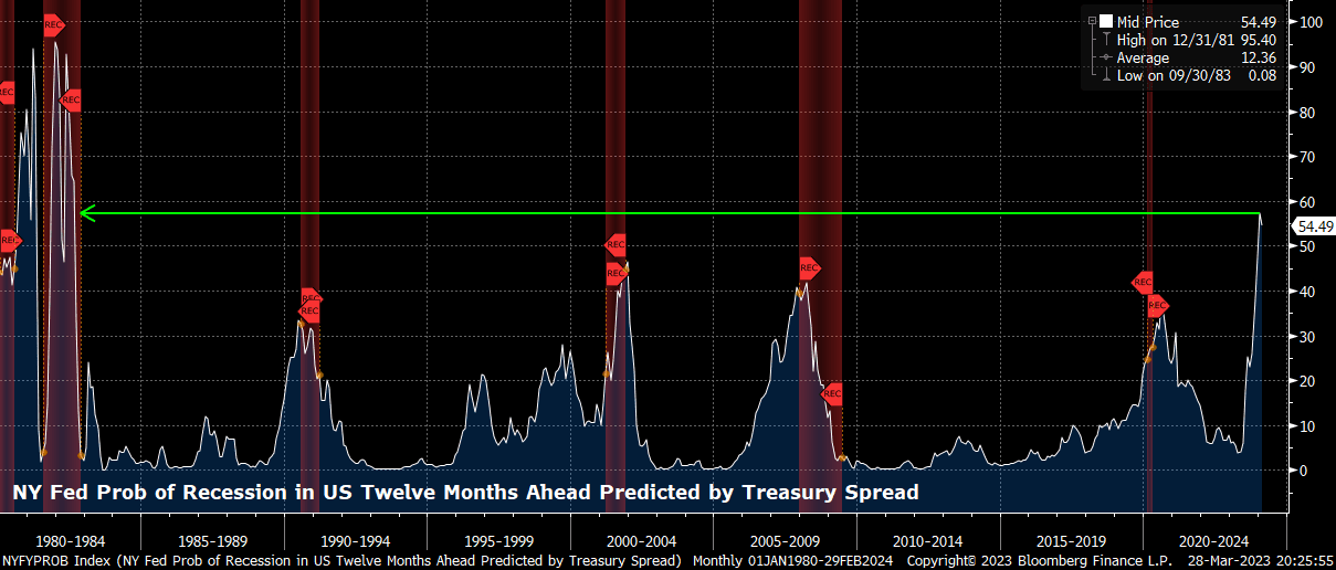 Καθόλου ενθαρρυντικό δεν είναι ούτε το παρακάτω διάγραμμα από την κεντρική τράπεζα της Νέας Υόρκης, όπου δείχνει πως η πιθανότητα ύφεσης είναι