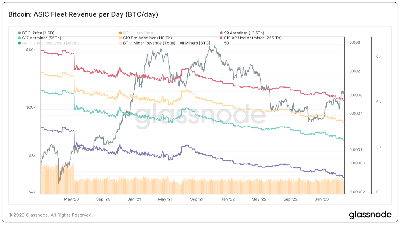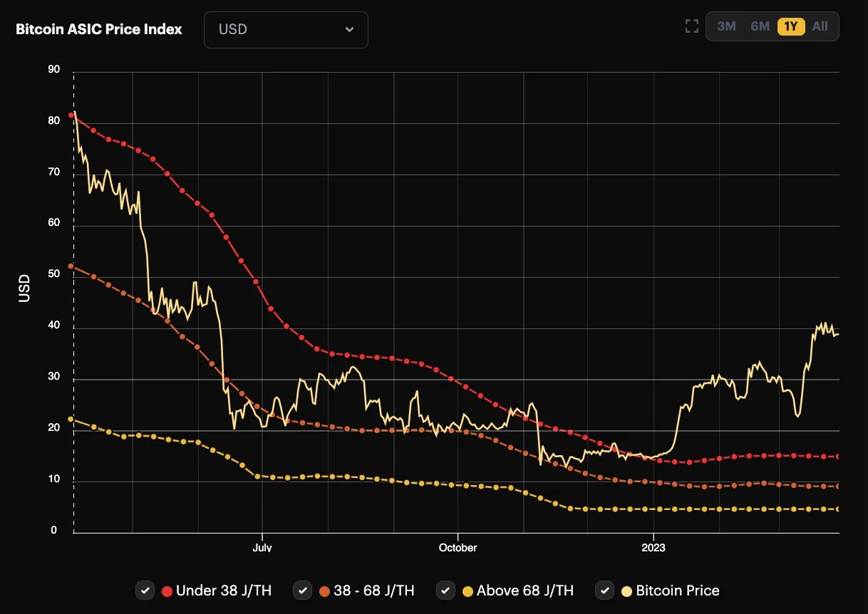 , παρατηρούμε πως παρά την ανάκαμψη της τιμής του Bitcoin και τις ισχυρές επιδόσεις τους τελευταίους μήνες στις μετοχές εξόρυξης, οι τιμές ASIC παρέμειναν χαμηλά. Η αυξανόμενη ισοτιμία κατακερματισμού άσκησε πρόσθετη πίεση στην αγορά ASIC. Τόσο σε όρους Bitcoin όσο και δολαρίου, η τιμή τους έχει ουσιαστικά ισοπεδωθεί από το φθινόπωρο του 2022.
