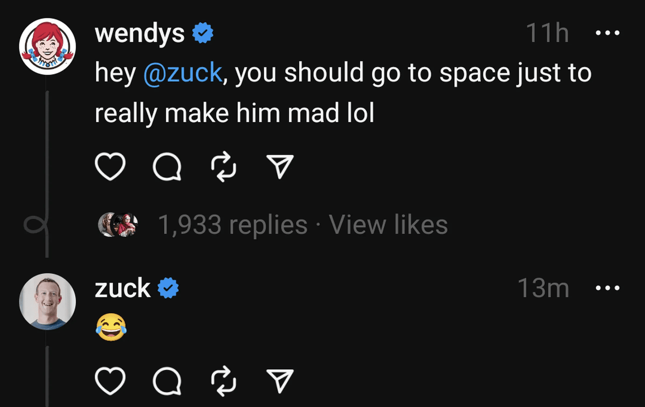 – από την πλευρά του Zuckerberg, ο οποίος σχολίασε ένα αστείο που έκανε ο επίσημος λογαριασμός της fast food αλυσίδας Wendy’s στο Threads. Ειδικότερα, έγραψε στον Zuckerberg πως