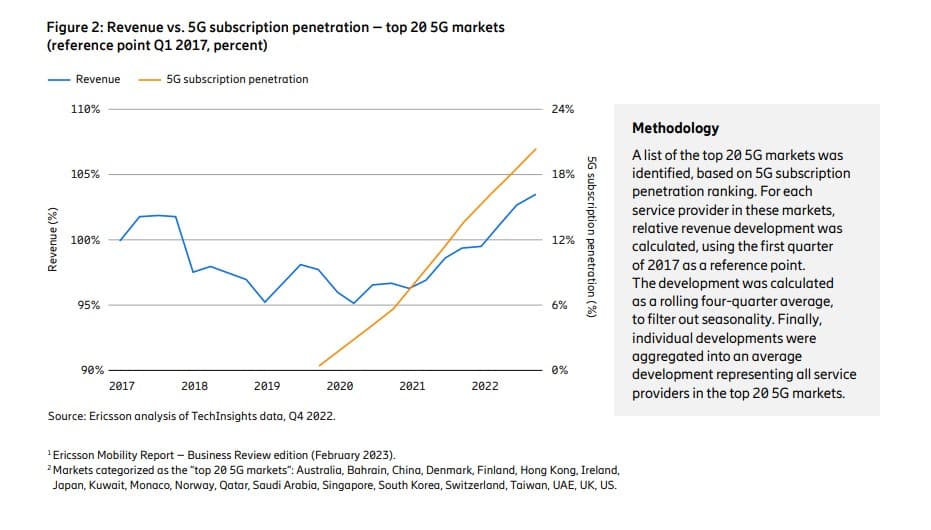 «Η παγκόσμια υιοθέτηση της τεχνολογίας 5G έχει ξεπεράσει το 1 δισ. συνδρομές, αύξηση που συνοδεύεται από άνοδο των εσόδων για τους παρόχους υπηρεσιών επικοινωνιών σε κορυφαίες αγορές για το 5G» αναφέρει η Ericsson. Μάλιστα, οι αναλυτές της εταιρείας σχολιάζουν ότι η αύξηση των συνδρομών σε δίκτυα 5G συνοδεύεται από αύξηση των εσόδων από υπηρεσίες.
