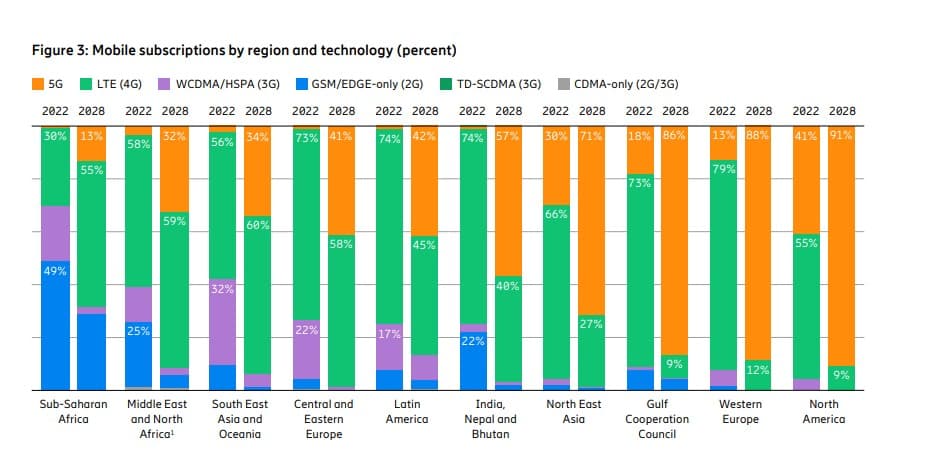 Ωστόσο, οι συνδέσεις σε δίκτυα 4G θα βαίνουν μειούμενες τα επόμενα χρόνια, αρχής γενομένης από το 2023, με τις εκτιμήσεις να τοποθετούν τις συνδρομές στα 3,8 δισ. έως τα τέλη του 2028, καθώς οι συνδρομητές θα μεταπηδούν σταδιακά σε συμβόλαια 5G.