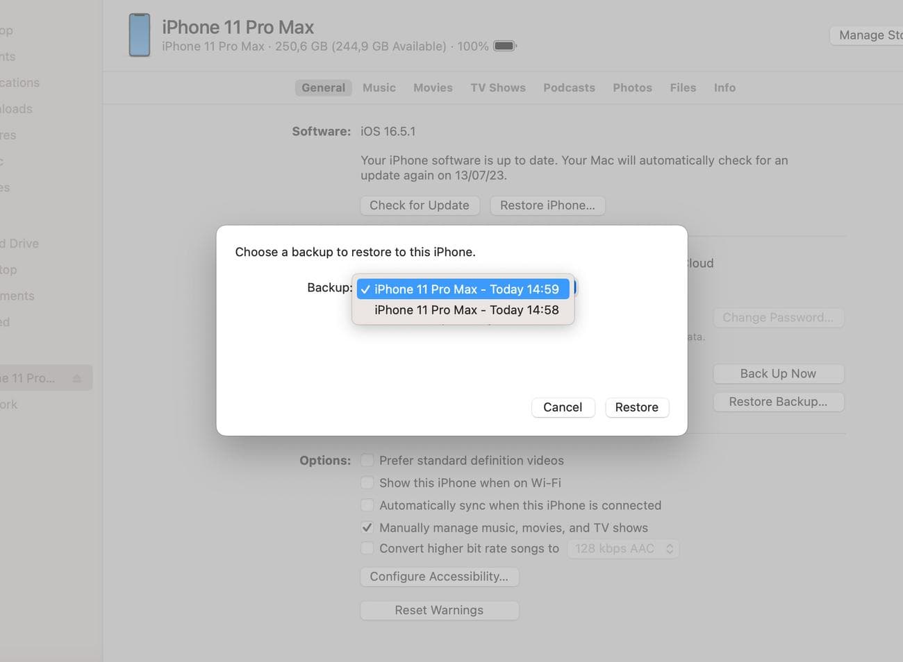 Εάν τελικά κάνετε υποβάθμιση από iOS 17 σε iOS 16, ο υπολογιστής σας θα σας ρωτήσει εάν θέλετε να ρυθμίσετε το iPhone ή το iPad σας ως νέο ή να επαναφέρετε δεδομένα από ένα αντίγραφο ασφαλείας. Επιλέξτε την επιλογή Restore from Backup και, στη συνέχεια, επιλέξτε το αρχειοθετημένο αντίγραφο ασφαλείας με δεδομένα iOS 16. Αυτό είναι σημαντικό επειδή δεν μπορείτε να επαναφέρετε ένα αντίγραφο ασφαλείας iOS 17 σε μια συσκευή που εκτελεί iOS 16.