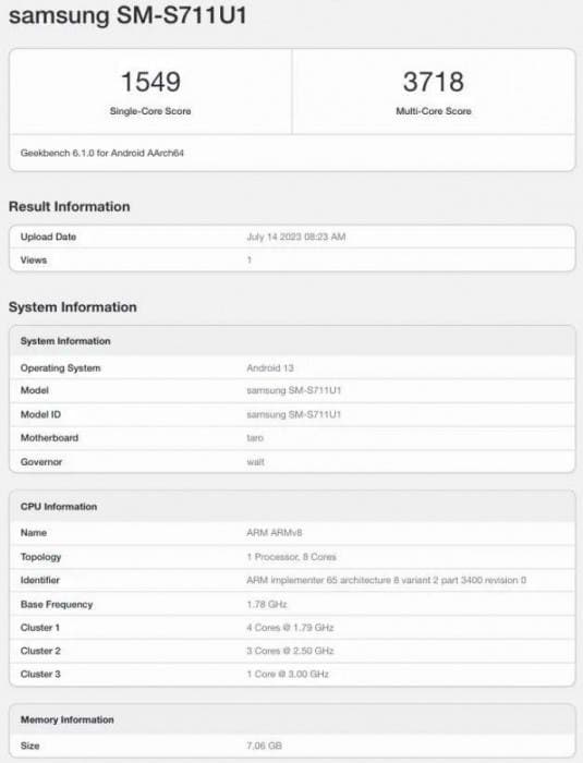 Η αμερικανική παραλλαγή του τηλεφώνου φέρει τον αριθμό μοντέλου SM-711U1 και αντλεί ενέργεια από ένα Qualcomm Snapdragon 8 Gen 1 SoC. Ο επεξεργαστής έχει μέγιστη ταχύτητα ρολογιού 3,0 GHz και διαθέτει τρεις πυρήνες απόδοσης στα 2,50 GHz. Διαθέτει επίσης τέσσερις πυρήνες απόδοσης χρονισμένους στα 1,79 GHz. Η αμερικανική παραλλαγή του S23 FE έχει 8GB μνήμης RAM και τρέχει Android 13, πιθανότατα με το One UI 5.1 skin. Η συσκευή σημείωσε επίσης 1549 και 3718 βαθμούς στις δοκιμές ενός πυρήνα και πολλαπλών πυρήνων του Geekbench 6.