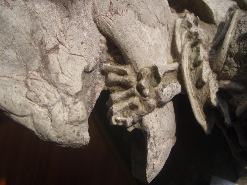 Λεπτομέρεια που δείχνει το μπροστικό πόδι του θηλαστικού να αρπάζει την κάτω σιαγόνα του δεινόσαυρου (Canadian Museum of