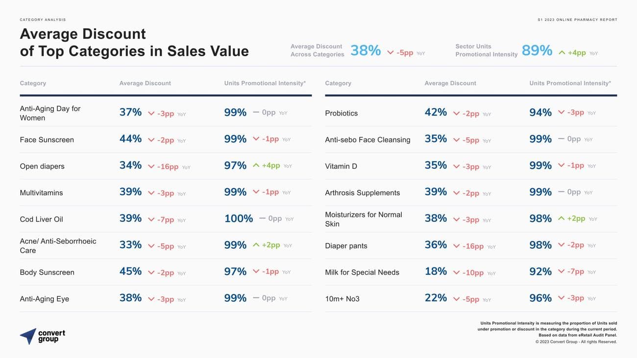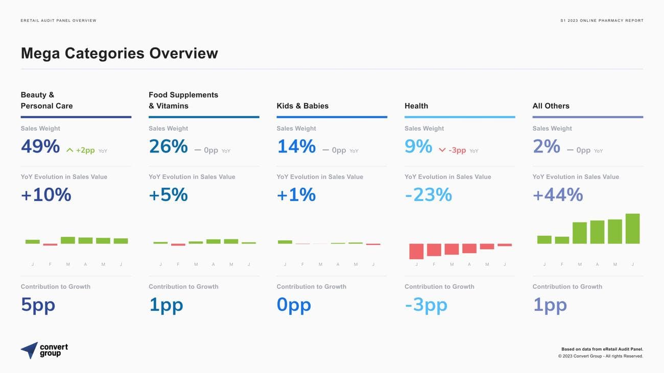 Στις κατηγορίες που αυξήθηκαν σε αξία (€) online αγορών σε επίπεδο εξαμήνου αναδεικνύονται οι εξής: +10% σε προϊόντα ομορφιάς και προσωπικής φροντίδας, +5% σε συμπληρώματα διατροφής και βιταμίνες και +1% σε βρεφικά και παιδικά είδη. Μείωση στις πωλήσεις γνώρισαν τα προϊόντα υγείας κατά 23%, καθώς προϊόντα που βρίσκονταν για καιρό στις υψηλότερες θέσεις ζήτησης (όπως οι μάσκες προστασίας και τα διαγνωστικά τεστ κορονοϊού) αποτελούν όλο και περισσότερο χαμηλή προτεραιότητα στα καλάθια του αγοραστικού κοινού.