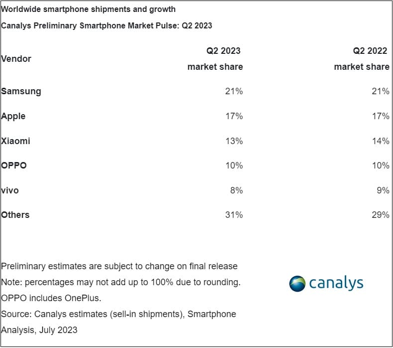 Σύμφωνα με τα στοιχεία της εταιρείας ερευνών Canalys, η Samsung διατήρησε την ηγετική θέση με μερίδιο αγοράς 21%, ενώ η Apple κράτησε τη δεύτερη θέση με μερίδιο αγοράς 17%. Ωστόσο, εκτός των δύο πρώτων, η μείωση των αποστολών smartphone αποκαλύπτει σημάδια βελτίωσης, καθώς τα αποθέματα των περισσότερων προμηθευτών επιστρέφουν σε υγιέστερα επίπεδα, ενώ οι μακροοικονομικές συνθήκες σταθεροποιούνται.