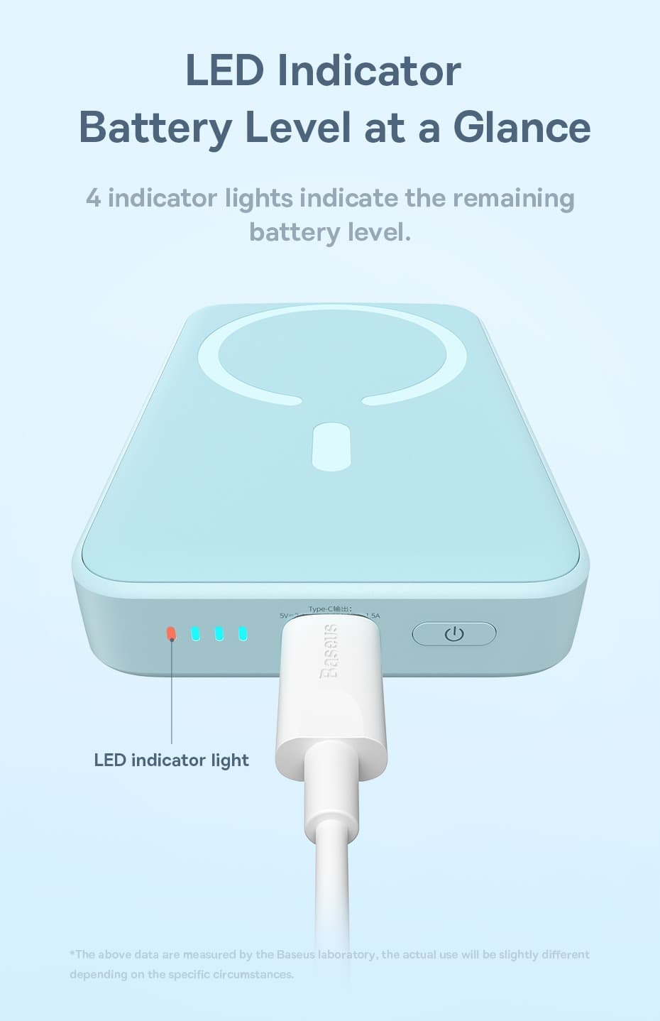 Στη βάση του, δίπλα στη θύρα USB-C έχει έναν δείκτη μπαταρίας, με 4 LED, και ένα κουμπί Power.