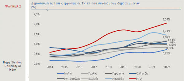 Η αβεβαιότητα αφορά στον κίνδυνο υποκατάστασης του ανθρώπινου δυναμικού από τα προγράμματα τεχνητής νοημοσύνης. Ωστόσο, υπάρχει και η άλλη επιχειρηματολογία, σύμφωνα με την οποία, η ΤΝ δεν θα οδηγήσει, σε σημαντικό βαθμό, σε απώλεια θέσεων εργασίας, αλλά θα αλλάξει τις ειδικότητες που απαιτούνται, με όλο και περισσότερες επιχειρήσεις να αναζητούν εξειδικευμένα στελέχη στην ΤΝ (Γράφημα 2).