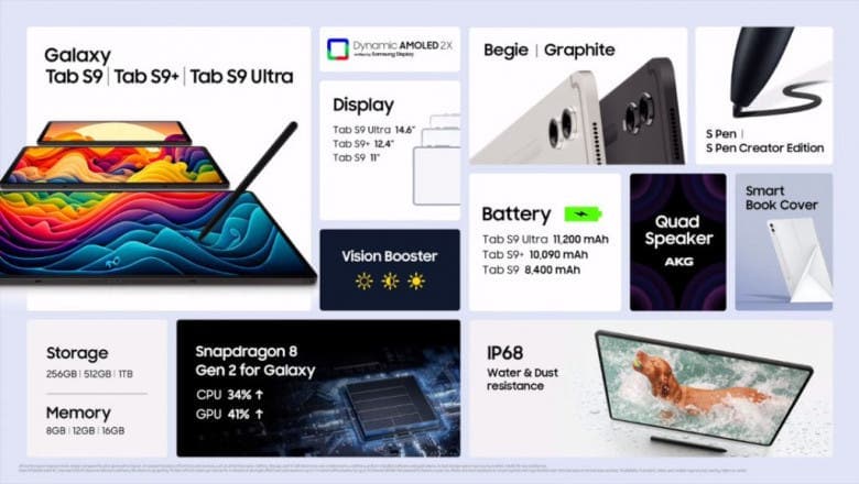 • Storage: 8GB+128GB/12GB+256GB (Tab S9); 12GB+256GB/512GB (Tab S9+); 12GB+256GB/512GB or 16GB/1TB (Tab S9 Ultra)