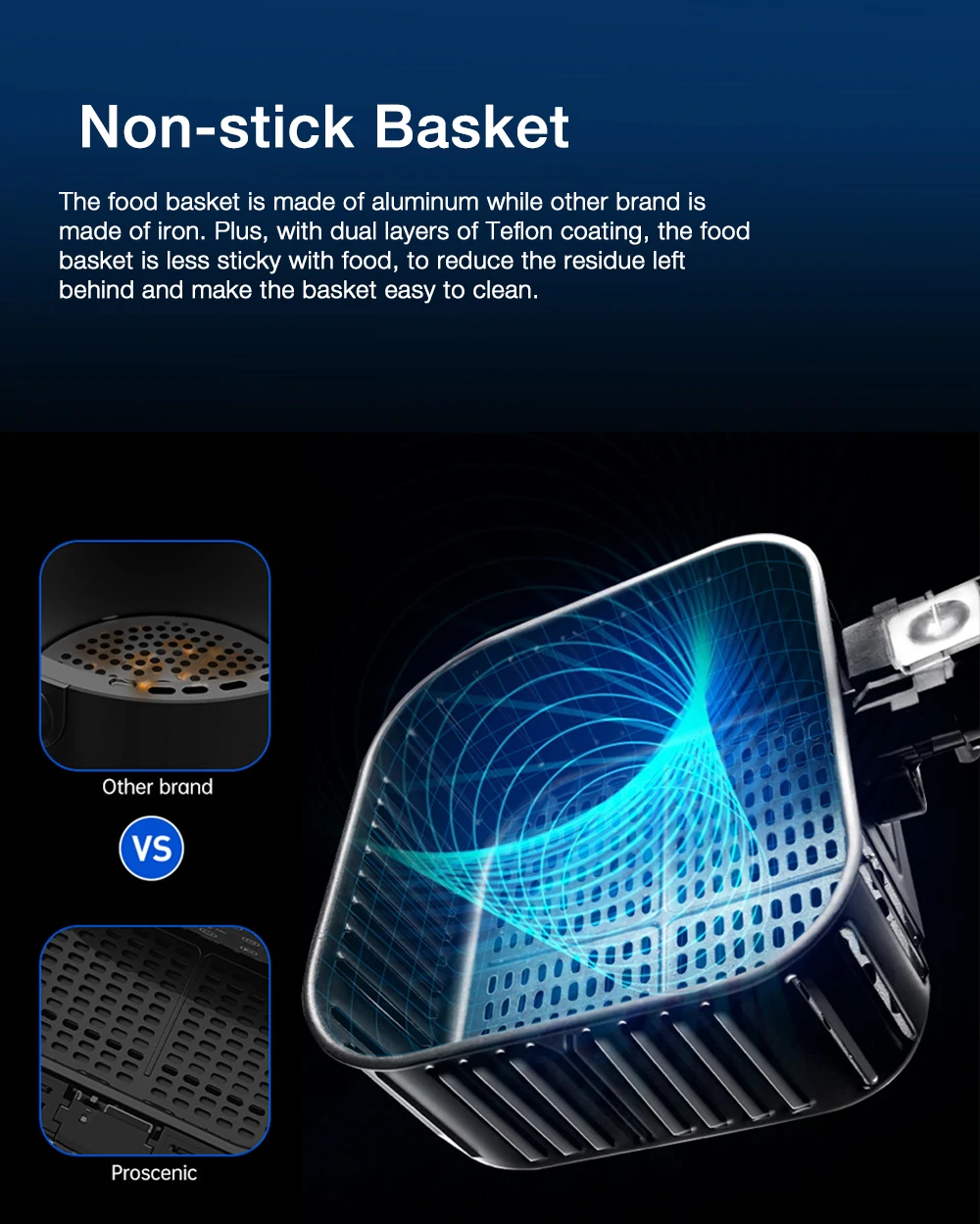 Η αεροφριτέζα της Proscenic έχει κάδο αλουμινίου με διπλή επίστρωση από τεφλόν, ο οποίος έχει χωρητικότητα 5.5L , που σημαίνει ότι μπορεί να χωρέσει αρκετό φαί για να ταΐσει τουλάχιστον 2 άτομα ικανοποιητικά, ή και 3, αν είστε τίποτα φυσιολογικοί, και δεν τρώτε σαν και εμένα.