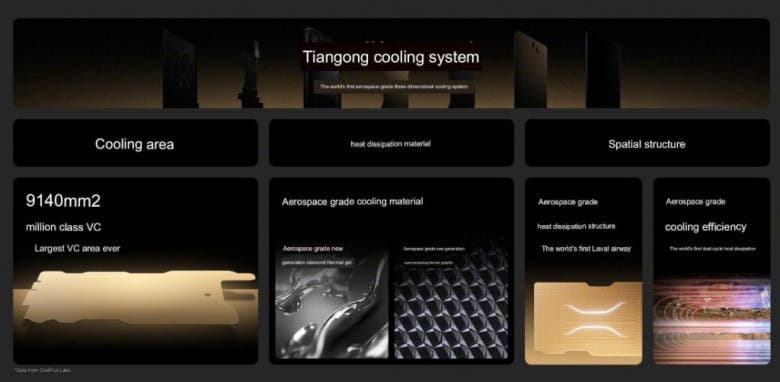 Το σύστημα ψύξης Tiangong είναι η πρώτη στον κόσμο δομή ψύξης χώρου σε επίπεδο αεροδιαστημικής, φέρνοντας το σύστημα ψύξης κινητών τηλεφώνων στην εποχή της τρισδιάστατης ψύξης. Μέσω της καινοτομίας της διαστημικής δομής, η OnePlus είπε ότι έχει ενσωματώσει σύστημα απαγωγής θερμότητας διπλής κυκλοφορίας σε ένα κομμάτι VC. Ο όγκος του νερού διπλασιάζεται, γεγονός που μπορεί να απορροφήσει περισσότερη θερμότητα. Ταυτόχρονα, ο όγκος της κοιλότητας της κυκλοφορίας αερίου-υγρού διπλασιάζεται, από την παραδοσιακή αεριοποίηση μιας ζώνης θερμότητας έως την αεριοποίηση ζώνης διπλής θερμότητας. η περιοχή επαφής της πηγής θερμότητας είναι πολλές φορές Η σημαντική αύξηση έχει αυξήσει την ισοδύναμη ταχύτητα του κύκλου ψύξης κατά 50%.