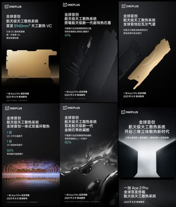 ότι το Ace 2 Pro στη σειρά OnePlus Ace που θα παρουσιαστεί τον Αύγουστο, θα είναι το πρώτο στον κόσμο με  τρισδιάστατο σύστημα ψύξης αεροδιαστημικής ποιότητας: «Σύστημα ψύξης Tiangong». Η OnePlus είπε ότι το σύστημα ψύξης θα είναι το πιο ισχυρό VC στη βιομηχανία αυτή τη στιγμή και αυτό το VC είναι τουλάχιστον δύο γενιές μπροστά από τον κλάδο. Η περιοχή VC φτάνει τα 9140 mm², το μόνο VC 10.000 επιπέδων στη βιομηχανία και είναι περισσότερο από διπλάσιο από τις τυπικές προδιαγραφές ενός VC με ένα τσιπ στον κλάδο.​​​​