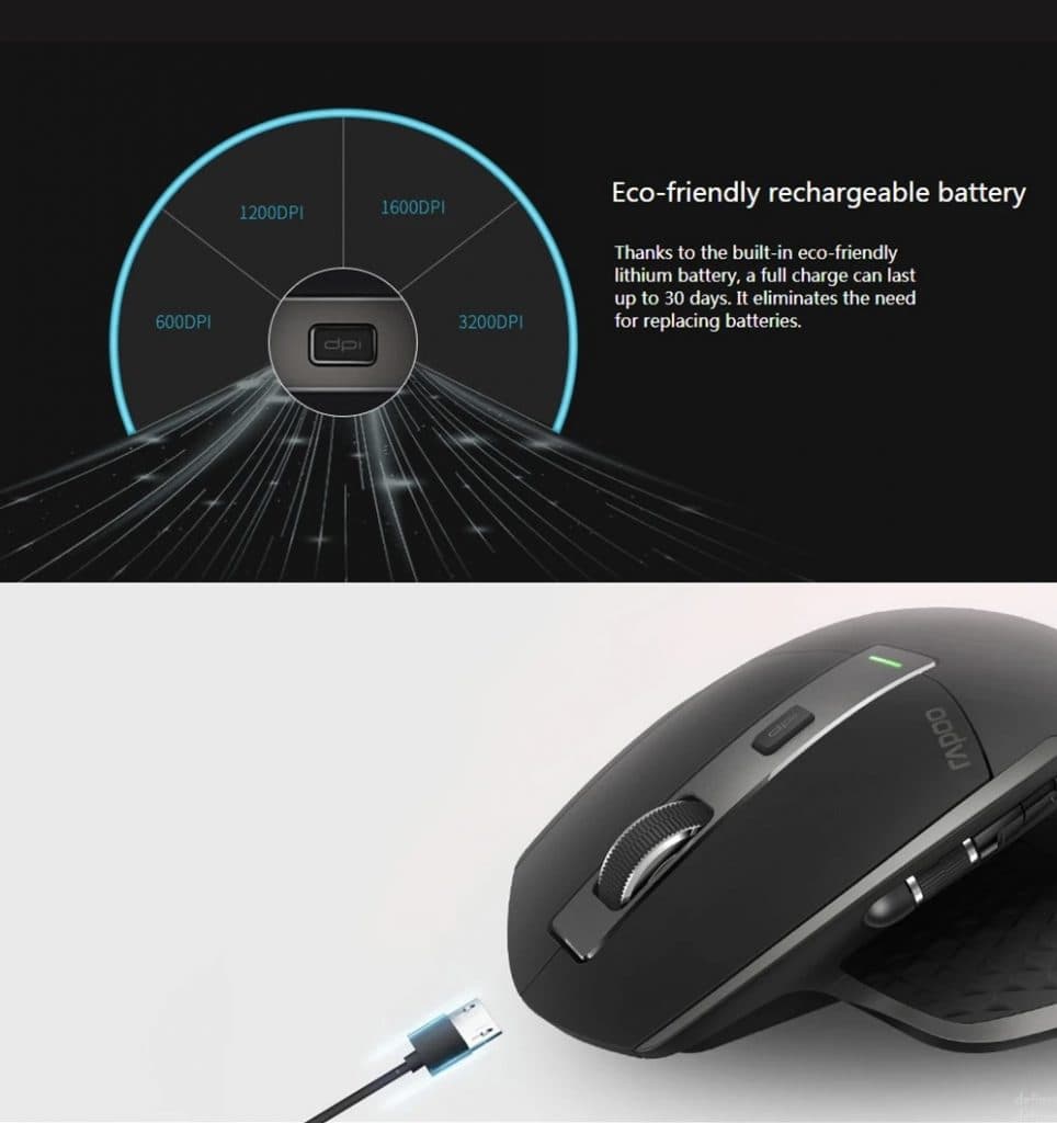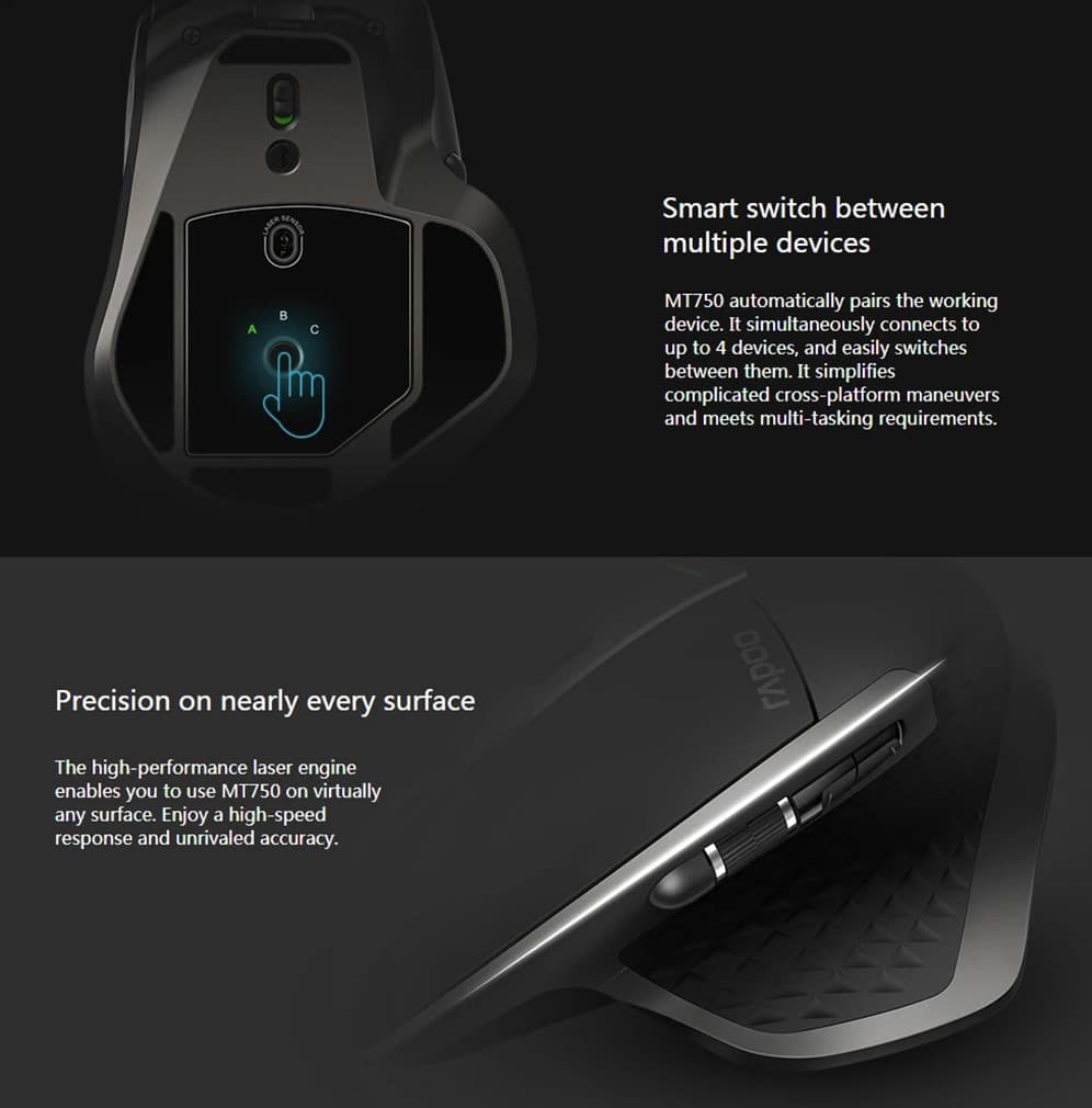 Το Rapoo MT750L είναι ασύρματο, multi-mode ποντίκι, που σημαίνει οτι μπορείτε να εκμεταλλευτείτε τις πολλαπλές κεραίες του για να το συνδέσετε με μέχρι και 4 διαφορετικές συσκευές ταυτόχρονα, και να εναλλάσσετε το ποια θα το χρησιμοποιεί με ένα απλό κλικ.