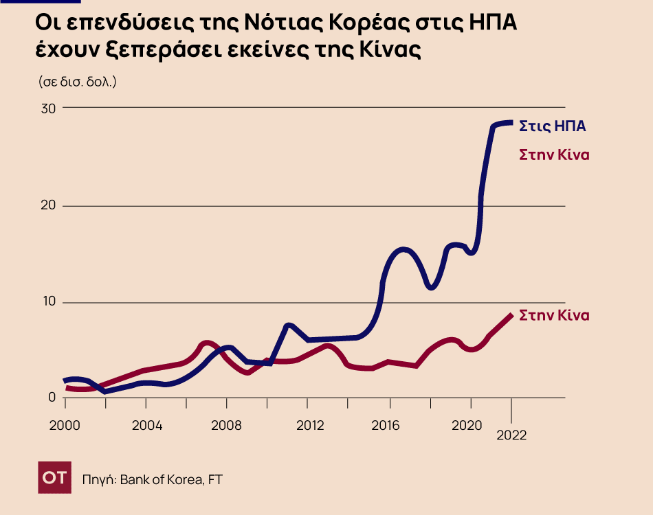 Σύμφωνα με στοιχεία που δημοσίευσε η Τράπεζα της Κορέας τον Ιούνιο, η Νότια Κορέα εξήγαγε περισσότερα αγαθά στις ΗΠΑ το 2022 από ό,τι στην Κίνα, για πρώτη φορά από το 2004.