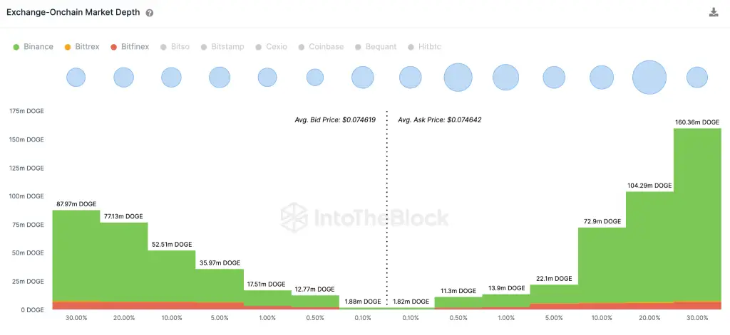 Το διάγραμμα On-chain Market Depth chart παρακάτω δείχνει ότι η τιμή Dogecoin είναι πιθανό να μειωθεί κατά 10% για να φτάσει τα $0,068.