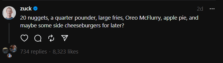 Συγκεκριμένα, ο CEO της Meta απάντησε κάτω από μια ανάρτηση της αλυσίδας fast food των McDonald’s στο Threads, που ρωτούσε τον κόσμο “Θέλετε κάτι να παραγγείλετε;”. Σε εκείνο το thread έγραψε τι παραγγέλνει συχνά, αφού είναι μια από τις αγαπημένες του παραγγελίες, για να φτάνει τις 4.000 θερμίδες την ημέρα. “